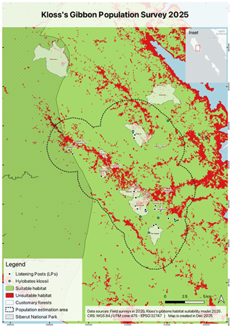 Based on the gibbon population survey in 2021, Kayupuring village is considered a high suitable habitat area for Javan gibbons. Therefore, patrols are conducted by tracking the routes most prone to hunting in the village. A similar patrol method is also carried out in Pacet village, which is the easternmost distribution point of Javan gibbons in the Dieng Mountains. Considering that many forests have been converted into durian and non-shade coffee gardens in Mendolo, patrols are carried out as much as possible by following the movement of Javan gibbons to determine their movement routes, feeding preferences, and behavior in low suitable habitats. The results of this activity are expected to be used as a consideration for tree planting programs, so that tree planting points aimed at Javan gibbons, indicated to be isolated in Mendolo, will have natural crossing corridors in the future.